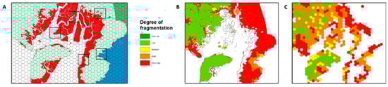 Evolution of fragmentation status using PFI and a homogeneous tessellation by hexagons of 10 km2. PFI value: very high (PFI ≥ 0.8), high (0.6 ≤ PFI ≤ 0.79), medium (0.4 ≤ PFI ≤ 0.59), low (0.39 ≤ PFI ≤ 0.2), and very low (PFI ≤ 0.2).