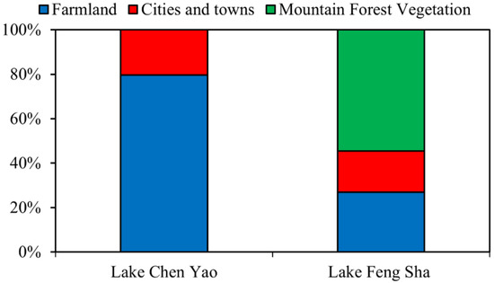 Employing Envi5.3 software to crop and supervise the classification of remote-sensing images of Lake Chen Yao and Lake Feng Sha, respectively, and ArcGIS10.2 software to rasterize the cropped and supervised classified images and calculate the proportion of the classified area, we concluded that there are significant differences in the distribution of land use types between the two lakes. Lake Feng Sha is surrounded by mountains in the west, and its main land use types are mountain forest vegetation; the distribution of its mountainous vegetation, agricultural land, and towns is 54.53%, 26.93%, and 18.53%, respectively. In contrast, Lake Chen Yao is dominated by the distribution of farmland and towns, and its four sides are mainly surrounded by farmland with wide coverage, accounting for 79.59%, followed by towns, accounting for 20.41% (Figure 2).
