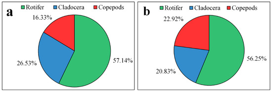 Figure 4. Percentage species composition of the zooplankton community in Lake Chen Yao (a) and Lake Feng Sha (b).
