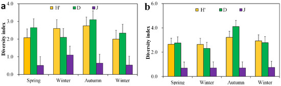 Figure 5. Seasonal distribution of zooplankton diversity index in Lake Chen Yao (a) and Lake Feng Sha (b).