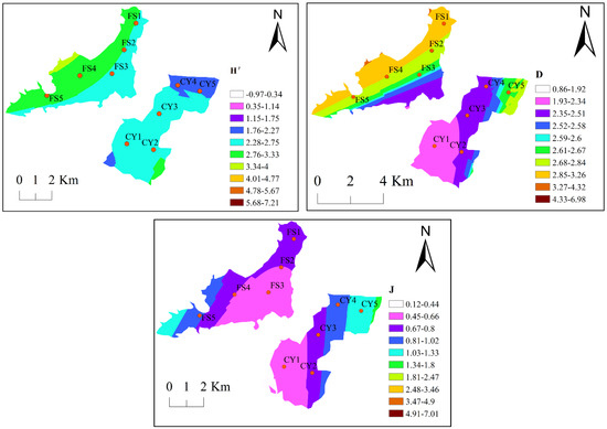 Spatially, the H′ index of Lake Chen Yao shows a general trend of gradually increasing from north to south, the D index shows a trend of gradually increasing from southwest to northeast, and the spatial distribution trend of the J index is basically consistent with the D index. For Lake Feng Sha, the H′ and D indices are consistent, both showing a decreasing trend from west to east, while the J index demonstrates a general decreasing trend from southwest to northeast (Figure 6).