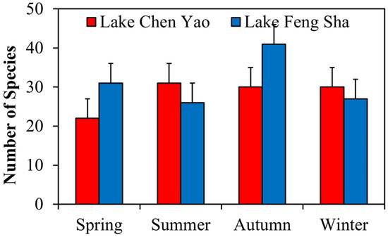 The analysis of the number of zooplankton species in Lake Chen Yao and Lake Feng Sha in the four seasons illustrated that there were obvious seasonal variations (Figure 7), and the trends of the seasonal distribution of zooplankton in the two lakes were as follows: Lake Chen Yao: summer (31 species) > autumn and winter (both 30 species) > spring (22 species); Lake Feng Sha: autumn (41 species) > spring (31 species) > winter (27 species) > summer (26 species). There were obvious seasonal differences in the two lakes.