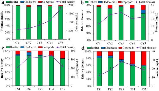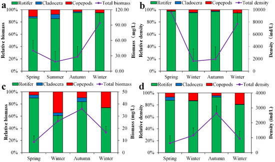 Figure 8. Seasonal distribution of zooplankton biomass and density in Lake Chen Yao (a,b) and Lake Feng Sha (c,d).