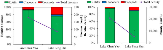 As displayed in Figure 10, regarding the composition of zooplankton in terms of density and biomass in the two lakes, both had the highest percentage of rotifers, followed by copepods and Cladocera. However, the total zooplankton biomass and total density in Lake Chen Yao were higher than those in Lake Feng Sha, showing obvious spatial differences. In terms of density, both lakes have the widest distribution of rotifers and the lowest distribution of cladoceran species, with the density of rotifers in Lake Chen Yao being higher than that in Lake Feng Sha, and the density of cladoceran species and copepods being lower than that in Lake Feng Sha. In terms of biomass, the two lakes still had a high biomass of rotifers, with Lake Chen Yao having a higher biomass of rotifers, while the biomass of branchiopods and copepods was lower compared to Lake Feng Sha.