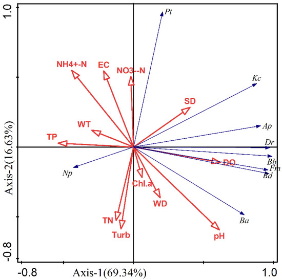 Figure 11. RDA analysis ranking the biomass of dominant species of zooplankton and environmental factors in the surrounding area of Lake Chen Yao and Lake Feng Sha. (Bb: Brachionus budapestinensis; Kc: Keratella cochlearis; Dr: Diurella rousseoeti; Ap: Asplanchna priodonta; Pt: Polyarthra trigla; Fm: Filinia maior; Ba: Brachionus angularis; Np: Nauplius; Bd—Brachionus diversicornis).