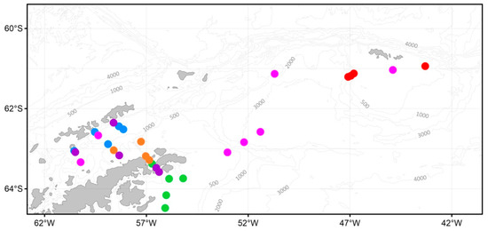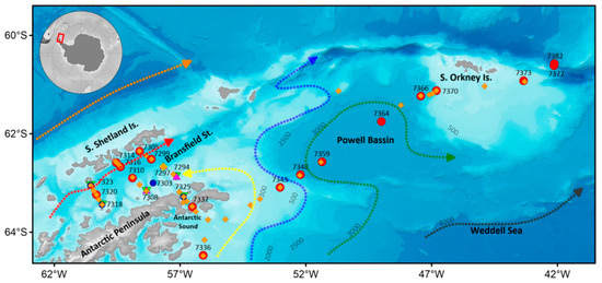 The sampling stations and the main currents off the Antarctic Peninsula. Numbers represent names of complex stations (except for the station 7303). Dotted lines represent currents, according to [35,36]. Orange line—the Antarctic Circumpolar Current (ACC), red line—the Bransfield Current (BC), yellow line—the Antarctic Coastal Current (ACoC), blue line—the Antarctic Shelf Front (ASF), green line—the Weddell Front (WF), grey line—Weddell Deep Water (WDW). Plankton nets: red circle—Double Square Net (DSN) and Multinet integrated, blue circle —DSN, orange diamond—Apshtein, pink triangle—Bongo, green triangle—WP-2.
