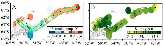 Spatial distribution of potential temperature (A) and salinity (B) in the study area at depths of 0–50 m. Stations are marked with black dots; sections considered below are colored in green.