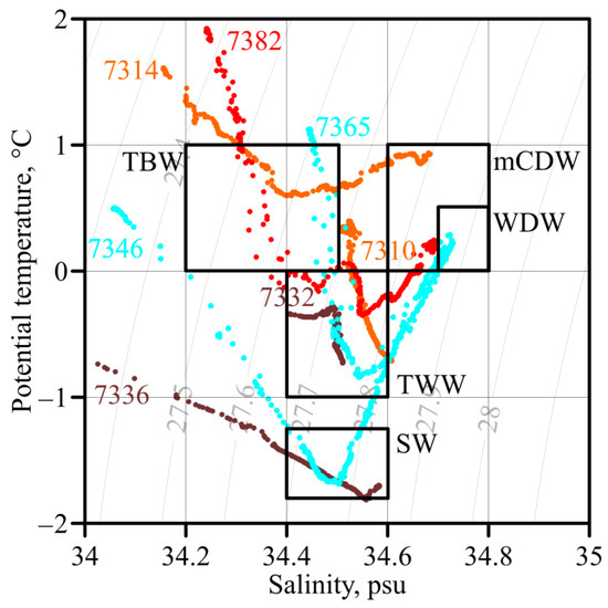 Bransfield Strait (Figure 3 and Figure 4) was filled with cold and saline Transitional Zonal Water with Weddell Sea influence (TWW), spreading from north to south. Transitional Zonal Water with Bellingshausen Sea influence (TBW) was propagated to the northeast along the South Shetland Islands in the form of a narrow high-velocity jet called the Bransfield Current (BC) and only reached the middle of the Strait in the upper 50 m. Modified Circumpolar Deep Water (mCDW) was observed at a depth of 300 m. The maximum potential temperature of 1.70 °C and a minimum salinity of 34.12 psu were recorded in the surface layer at stn. 7313. The minimum potential temperature of −0.80 °C was observed at a depth of 300 m in the middle of the Strait. The maximum salinity of 34.68 psu corresponded with the core of mCDW and was observed at stations 7314 and 7317. The waters near the S. Shetland Islands (Figure 4, stn. 7314) were stratified more by salinity than by potential temperature. The waters of the central part of the Strait were stratified mainly by the potential temperature, while the variations in salinity did not exceed 0.10 psu (Figure 4, stn. 7310). All three water masses were well defined by the 0 °C isotherm.