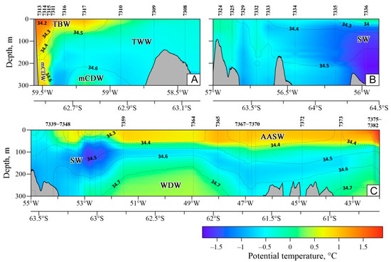Vertical distribution of potential temperature (°C, color) and salinity (psu, dotted line) on the sections: (A)—the Bransfield Strait, (B)—the Antarctic Sound, (C)—the Powell Basin and area northeast of the South Orkney Islands. Station numbers are located at the top of the diagram, the geographic location of the station is shown as a vertical line. The bottom topography is taken from the GEBCO2021 database https://www.gebco.net/data_and_products/gridded_bathymetry_data/gebco_2021/ (accessed on 19 May 2022).