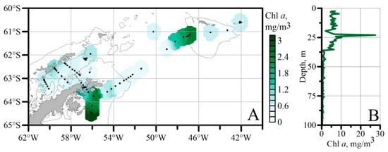 Mean values of Chl a concentrations were calculated for the upper 100 m of the water column, which was the estimated average depth of the euphotic zone. The concentrations were highest south of the Antarctic Sound and southwest of the South Orkney Islands (>2.4 mg m−3) and lowest throughout the waters of the Powell Basin (Figure 5A). Intermediate concentrations with an even gradation were observed in the Bransfield Strait and southeast of the South Orkney Islands. The maximum values’ Chl a concentrations in the upper 30 m of the water column were recorded south of the Antarctic Sound (stn. 7336) (Figure 5B).