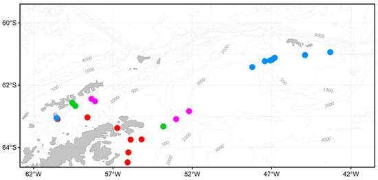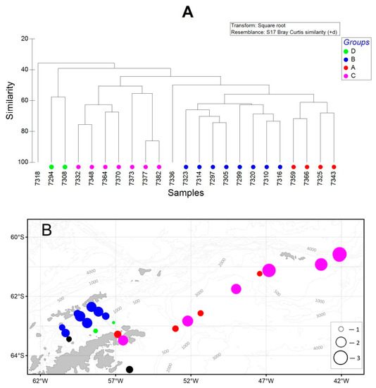 The density of salps and euphausiids aggregations was calculated as the ratio of the number of these organisms in the catch per 1000 m3 of filtered water [74]. The similarity between stations based on quantitative data (density of organisms in a sample) was assessed using the Bray–Curtis index [71]. To assess the reliability of clustering, the SIMPROF permutation test (number of permutations 999, p = 0.05) was performed [68].