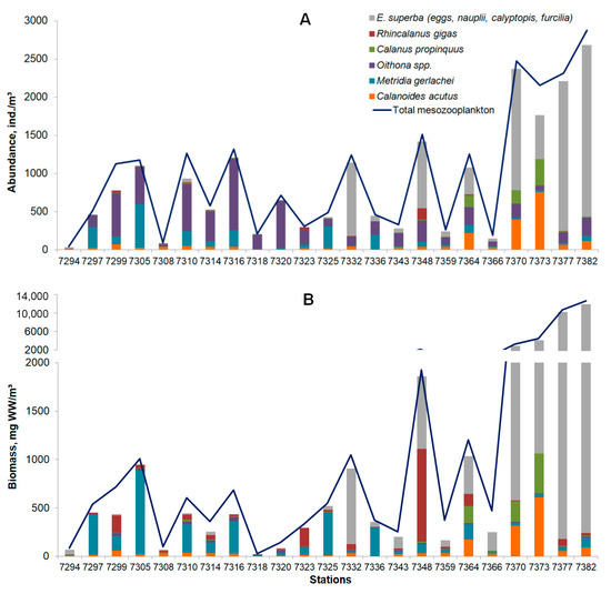Total abundance ((A), ind./m3), biomass ((B), mg WW/m3), and species composition of mesozooplankton in the study area.