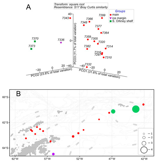 Diagram (3D representation) of the PCO ordination of stations by abundance (ind./1000 m3) (A) and spatial distribution of stations grouped by the PCO method (B). Groupings: red circle—main, violet—ice margin, green—S. Orkney shelf. Total abundance (ind./1000 m3): 1—50; 2—350; 3—1500; 4—6500. See Figure 9 for total abundance designation.