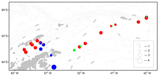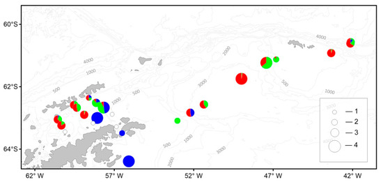Spatial distribution of the macrozooplankton abundance (ind./1000 m3) and contribution (%) of the most abundant species: blue circle—E. superba, green—T. macrura, red—S. thompsoni. Total abundance (ind./1000 m3): 1—0; 2—10; 3—100; 4—400. See Figure 9 for total abundance designation.