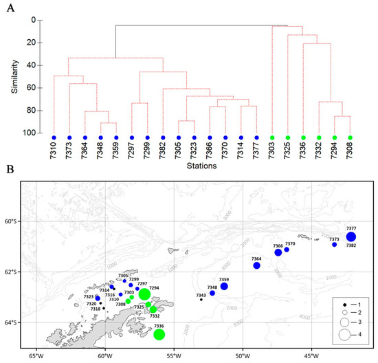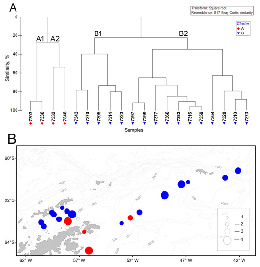Dendrogram (A) of the stations resulting from cluster analysis based on the abundance of macrozooplankton and the spatial distribution of stations grouped by cluster analysis (B). Groupings: red circle—A, blue—B. Total abundance (ind./1000 m3): 1—0; 2—10; 3—100; 4—400. See Figure 9 for total abundance designation.