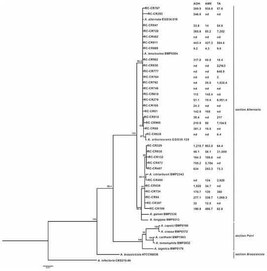 Bayesian phylogenetic tree based on the combined gene sequences of tef, gpd, and Alt a1 of 32 Alternaria strains isolated from chickpea. Bayesian posterior probabilities (>50) are shown at nodes. Alternaria infectoria CBS 210.86 was used as the outgroup. Mycotoxin profile (µg/g) of Alternaria strains is indicated next to each strain. AOH: alternariol, AME: alternariol monomethylether, and TA: tenuazonic acid. nd: not detected (≤LOQ).