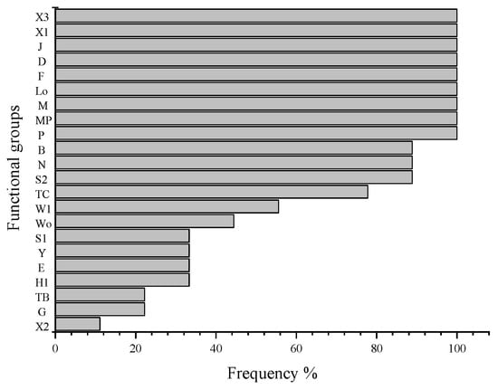 Reynolds et al. [6] proposed a method for the functional group classification of planktonic algae, and the results are displayed in Table 2. A total of 23 functional groups were identified: functional groups Y, B, J, X1, Lo, D, M, X2, X3, Wo, S1, A, E, TB, MP, P, G, H1, N, F, TC, S2, and W1. The frequency of occurrence for each functional group is shown in Figure 2. Functional groups D, F, Lo, J, M, MP, P, X1, and X3 appeared with a frequency of more than 90%, making them the dominant functional groups of spring, summer, and autumn during the study. Functional groups B, N, S2, TC, and W1 occur with a frequency between 50% and 90%, making them common functional groups. Functional groups Wo, S1, Y, E, H1, G, and TB occurred between 20% and 50% of the time, and only occurred in suitable habitats. The frequency of functional groups A and X2 was not more than 20%, which was low, making them occasional or rare functional groups.