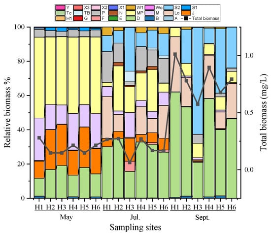In summer, the dominant functional groups are more abundant, and the proportions of each functional group are more uniform. Compared with May, the typical indicator species of water experiencing medium eutrophication were added, such as Kirchneriella sp. representing the Chlorophyta, and Fragilaria sp. of the Bacillariophyta, as well as Oscillatoria sp. and Chroococcus sp. of the Cyanobacteria. Additionally, the S2 functional group represented by the Spirulina sp. of the Cyanobacteria was also added. The habitats indicated are characterized by warm, shallow, highly alkaline water bodies, and because of the high water temperature in summer, they are suitable for the growth of functional group S2, which prefers warm habitats. The biomass was relatively low in July, which was associated with competition among phytoplankton functional groups, ingestion by other aquatic animals, and the heavy consumption of nutrient salts.
