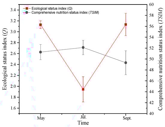 The temporal distribution of ecological status index (Q) and comprehensive nutrition status index (TSIM) (±S.E).