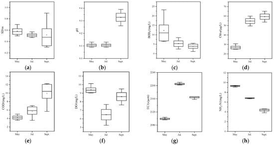 The results of the Nanhai Lake quality test are shown in Figure 5. The pH of the water body was greater than 9, and the lake water was weakly alkaline. The water temperature ranged from 18.49 to 31.08 °C; it began to rise in May, reached a maximum (31.08 °C) in July, and gradually decreased in September, with an average of 23.60 °C. TDS and EC exhibited the same trend as WT, with TDS ranging from 1047 to 1105 mg/L, with an average of 1078 mg/L, and EC ranging from 2096 to 2210 μs/cm, with an average of 2156 μs/cm; the TDS and EC values in May differ significantly from those in July and September (p < 0.05). SD, BOD5, NH3−N, and TP exhibit the same trend, with the highest values in May, and the lowest values in September, with the range of SD changes being 0.31 ~ 0.70 m, and the average value 0.54 m. BOD5 varied from 1.13 to 23.20 mg/L, with a mean value of 7.11 mg/L. NH3−N and TP ranged from 3.82 to 9.42 mg/L and 0.21 to 0.66 mg/L, respectively, with significant differences (p < 0.05) over three months, and had means of 6.80 mg/L and 0.37 mg/L, respectively. COD and Chl−a values showed a gradual upward trend from May to September. COD ranged from 3.58 to 12.23 mg/L, with an average value of 6.63 mg/L, and the COD value in September was significantly different from the COD value in May and July (p < 0.05). Chl−a varied from 24.90 to 62.11 μg/L, with a mean value of 47.06 μg/L, and the Chl−a value in May was significantly different from the Chl−a value in July and September (p < 0.05). The average of DO was 8.16 mg/L, with a maximum of 10.12 mg/L in May and a minimum of 5.25 mg/L in July.