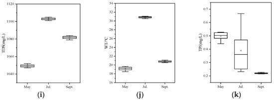 We refer to the “GB Surface Water Environmental Quality Standard” (3838−2002) for our evaluation. The BOD5 maximum in May was of Class V water standard (10 mg/L), and in July and September it was of Class III surface water standard (4 mg/L). NH3−N exceeded the Class V surface water range (2 mg/L) throughout the year and exceeded the standard more severely on occasion. In May, July, and September, the TP values reached the standard limits of Class V (0.4 mg/L), Class IV (0.3 mg/L), and Class III (0.2 mg/L), respectively, and there was a trend of gradual improvement.