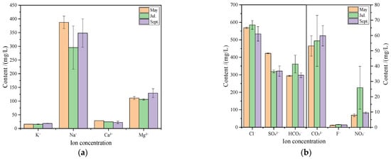 From the perspective of anion content (Figure 6), the content of cations in the water from May to September ranged from 441.16 to 543.29 mg/L, showing the characteristics of Na+ > Mg2+ > Ca2+ > K+. The anions ranged from 1223.24 to 1349.53 mg/L in the order Cl− > SO42− > HCO3− > CO32− > NO3− > F−. The cation content was low in July (441.16 mg/L), and the difference was not significant in May (543.29 mg/L) and September (518.24 mg/L) (p > 0.05). The anion content was the lowest in September (1223.24 mg/L), and the difference was not significant in May (1347.80 mg/L) and July (1349.53 mg/L) (p > 0.05). The heavy metal content is shown in Table 4, and the difference in heavy metal content from May to September was not significant (p > 0.05), with the Sr content being higher, followed by Li and Ba. According to the “GB Surface Water Environmental Quality Standard” (3838−2002), it was found that the SO₄²− and Cl− content seriously exceeded the standard limits (250 mg/L), and F− and NO₃− also exceeded the standard limits (the standard limit of F− was 1.5 mg/L, and of NO₃− was 10 mg/L), but the excess was not significant (p > 0.05) in the three seasons studied. The Na+ content far exceeded the range of Class III surface water (≥200 mg/L), and none of the heavy metals exceeded the standard in the water body.