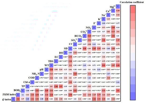 Pearson correlation analysis was performed between all environmental factors and the Q index and TSIM index from May to September (Figure 7), and the results showed that the Q index had a significant positive correlation with SD (p < 0.01), and a very significant (p < 0.01) and significant (p < 0.05) negative correlation with Mg2+ and HCO3−, respectively. The TSIM index was significantly positively correlated with Ca2+ (p < 0.05), significantly positively correlated with SO42− (p < 0.05), and very significantly (p < 0.01) and significantly negatively correlated with Cl− and TDS (p < 0.05), respectively. Overall, the relationship between the salt ions Mg2+, HCO3−, Ca2+, SO42−, and Cl− and water quality evaluation indicators was significant (p < 0.05) or even very significant (p < 0.01), indicating that the change in nutrient salt concentration was closely related to the Q index and TSIM index.