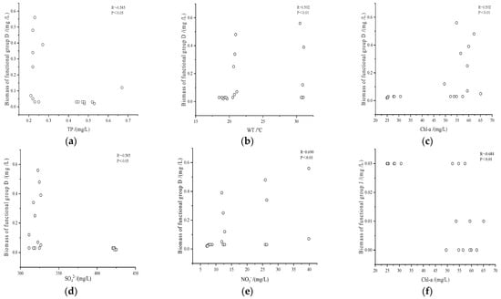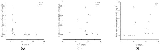 Relationship between biomass of dominant functional groups of phytoplankton and some water environmental factors (TP, WT, Chl−a, SO42−, NO32−, Ca2+, and K+) in Nanhai Lake. Notes: (a): relationship between biomass of functional group D and TP; (b): relationship between biomass of functional group D and WT; (c): relationship between biomass of functional group D and Chl−a; (d): relationship between biomass of functional group D and SO42−; (e): relationship between biomass of functional group D and NO32−; (f): relationship between biomass of functional group J and Chl−a; (g): relationship between biomass of functional group Lo and TP; (h): relationship between biomass of functional group Lo and Ca2+; (i): relationship between biomass of functional group S2 and K+.