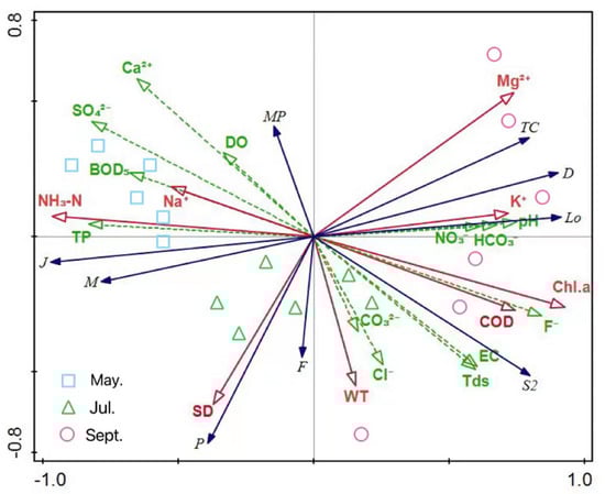In order to explore the effects of environmental factors on the community structure of phytoplankton, first the biomass removal trend (DCA) of the dominant functional group was analyzed. The results showed that the maximum gradient length of the sort axis was less than three, so redundancy analysis (RDA) was used for data selection (Figure 9). The Monte Carlo fitting method was used to test the significance of the factors. The Monte Carlo fitting method was applied to test the significance of the factors, and by screening Mg2+ (p = 0.002, F = 32.6), COD (p = 0.002, F = 12.3), NH3−N (p = 0.002, F = 14.4), Na+ (p = 0.002, F = 9.6), WT (p = 0.002, F = 16.5), SD (p = 0.002, F = 12.5), K+ (p = 0.002, F = 14.6), and Chl−a (p = 0.02, F = 13.5) were found to be significant explanatory variables, representing 67.1%, 14.8%, 9.3%, 3.8%, 3.0%, 1.1%, 0.9%, and 0.1% of the community variation, respectively, therefore being the key environmental factors affecting phytoplankton community variation. The environmental factors that did not have a significant impact are represented by dotted lines in Figure 9. The RDA analysis showed a certain temporal heterogeneity, with the second quadrant in May, the first and fourth quadrants in September, and the third and fourth quadrants in July. The first and second sort axes feature values of 0.5943 and 0.1825, respectively, explaining 59.43% and 77.67% of the biomass information, respectively. The first sort axis was positively correlated with Mg2+, K+, COD, Chl−a, and WT, and was negatively correlated with SD, Na+, and NH3−N. The second sort axis was positively correlated with Mg2+, K+, Na+, and NH3−N, and was negatively correlated with SD, COD, Chl−a, and WT. Functional group MP was significantly negatively correlated with WT, functional groups TC, D, and Lo were significantly positively correlated with Mg2+ and K+, functional group S2 was significantly positively correlated with COD, Chl−a, and WT, while WT and SD were significantly positively correlated with functional groups P and F, and MP, J, and M were significantly positively correlated with NH3−N and Na+.
