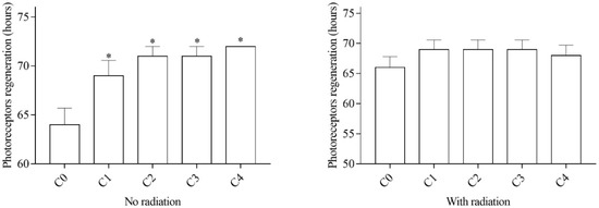 Chronic tests with G. tigrina: Photoreceptors regeneration (No radiation F4,55 = 6.994, p < 0.05; With radiation F4,55 = 0.6275, p < 0.05). * Each bar represents mean ± SD (n = 5 animals/group/replicates). Compared to the control, a significantly increased delay in the formation of photoreceptors was measured in the C1–C4 treated groups (Dunnett’s test).
