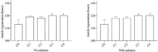 Chronic tests with G. tigrina: Auricle regeneration (No radiation F4,55 = 2.513 p < 0.05; With radiation F4,55 = 2.313, p < 0.05). * Each bar represents mean ± SD (n = 5 animals/group/replicates). Compared to the control, a significantly increased delay in the formation of photoreceptors was measured in the C1–C4 treated groups (Dunnett’s test).