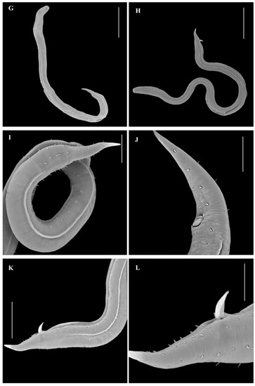 The body length of males ranges between 1.35–1.85 mm, with maximum body diameter varying between 65.19 and 75.88 µm (Table 1). Two crowns of labial setiform papillae are displayed on the lips region: 6 (1–2 μm) on the inner circle and 6 (2.15–3.66 μm) on the outer one. The unispiral fovea amphidialis (11.85–14.83 µm diameter) is located centrally on the main region of the cephalic capsule (Figure 1). A faint amphidial plate could be observed (Figure 1B). The whole pharynx length and its thickness in the isthmus part vary between 208.62–234 μm and 29.32–40.83 µm, respectively, enlarging posteriorly into a bipartite bulb (51.29–57.89 µm). The nerve ring is situated in the posterior pharynx part (at about half of its length, 57%). The cardia (hardly seen in one single specimen) is almost oval. The tail is 92.96–125.04 µm and pointed (spinneret). The length of the spicule is 51.25–64.83 µm and the gubernaculum is 30.83–32.86 µm. A ventral ala (215.95–378.06 µm in length) starts at app. 2/3 of male body length and reaches near the spicule. No pre-or post-cloacal supplements were noted. The reproductive system is monorchic with one anterior outstretched testis located on the ventral part of the body (Figure 1C and Figure 2H). De Man’s indices are provided in Table 1.