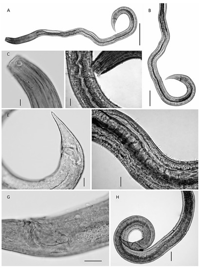 Pseudochromadora gomoi sp.n.—paratype male (A–H). (A) the entire male aspect; (B) detail of the reproductive system; (C) detail on the fovea amphidialis; (D) detail of the ventral alae; (E) detail of the tail region and terminal part of the lateral alae; (F) detail of the cuticule setae; (G) detail of the spicule apparatus and part of the ventral alae; (H) detail of the ventral ala and the reproductive system; (A,B)—scale 100 µm; (C)—scale 10 µm; (D,F,H)—scale 50 µm; and (E,G)—scale 20 µm.