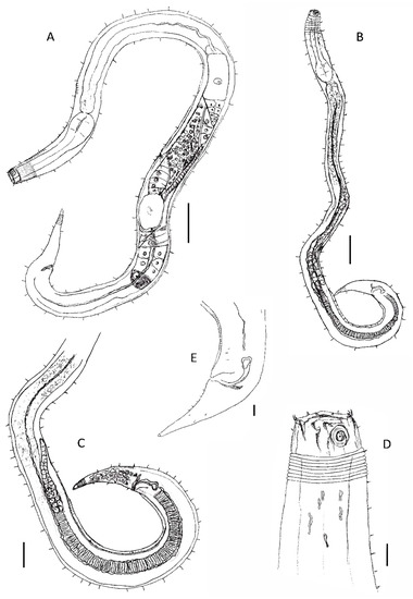 (A) female: overview of female body with details on the didelphic–amphidelphic reproductive system with reflexed ovaries; (B) male: overview of male body; (C) detail of the monorchic reproductive system with one anterior outstretched testis D detail on the head region (teeth and amphidial fovea); (A–C)—scale 50 µm; and (D,E)—scale 10 µm.