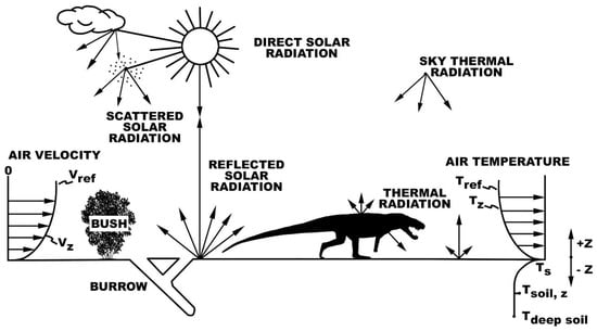 With no evidence of epidermal insulation outside of Archosauria, the rhynchosaur model used literature values for scaly skin dermal reflectivity and heat transmission []. Substantial subcutaneous fat layers are not widespread outside of synapsids [], so a minimal adipose layer value was input for the rhynchosaur model. Allowing burrowing behavior in Niche Mapper is plausible; while a 28 kg animal would require a relatively large burrow, burrowing lizards exist at similar sizes []. Komodo dragon burrows have been found for individuals that reach up to 70 kg []. Moreover, burrowing is widespread among sprawling, ectothermic species when thermally stressed [].
