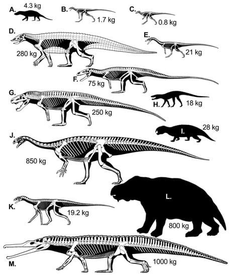 Postosuchus—Moving further crownward, rauisuchids are a group of large, exclusively carnivorous loricatans from the Middle and Late Triassic. Postosuchus reached 4.5 m in length and an estimated mass of 250+ kg [,]. The type and paratype specimens of Postosuchus were used as the basis of the proportional inputs (Figure 3G; []). Postosuchus is also primarily bidpedal, though given the number of quadrupedal intermediates between it and poposaurids it is clear this was another independent origin of bipedal locomotion in the Late Triassic [,]. Postosuchus appears less committed to obligate bipedalism than Poposaurus, in that the slightly built forelimbs could probably bear weight at low speeds, and there appears to be an ontogenetic shift to shorter arms as individuals age (cf. specimens in []) suggesting the possibility of facultatively quadrupedal hatchling or juvenile stages.