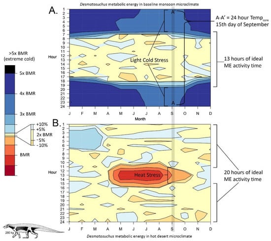 Looking at metabolic energy, in the low-latitude monsoon microclimate the 280 kg Desmatosuchus can be active all day (Figure 5A), albeit with increased metabolic rates from ~2 times BMR to 3–4 times BMR in morning and evening hours. This results in an increase in daily energy expenditure (DEE), which is presumably non-optimal, but research shows DEE is only tightly linked to BMR in placental mammals [,], and with sufficient foraging time ME increases are not inherently a problem until extreme multiples (5× or more) of BMR become necessary []. In the arid microclimate (Figure 5B), for 4 h at midday there is significant heat buildup, which cannot easily be offset by metabolic changes as an organism cannot reduce ME below the basic metabolic processes necessary to keep the animal alive (i.e., BMR), and when active, ME cannot be reduced even that far. So in the arid environment between the months of April and October a 280 kg Desmatosuchus would have encountered elevated temperatures when foraging at midday, and would presumably have altered its foraging time to avoid dangerous heat buildup (cf. []), which is common in modern desert ectotherms.
