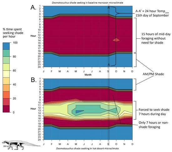 Daily fluctuations in shade seeking behavior. Modeled behavioral results for shade-seeking in a 280 kg Desmatosuchus in low latitude monsoon (A) and low latitude arid (B) microclimates.