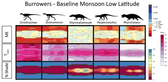 For taxa that we allowed to burrow, such as Dromomeron, a heuristic challenge with interpreting plots arises (Figure 7). Since burrows insulate occupants from the external environment, the metabolic costs of thermoregulation drop to near-BMRs levels while they are inside. While the ME plots show this accurately, an unintended consequence is that time spent in a burrow—the easiest and safest thermoregulation available—appears identical to the lowered ME seen in non-burrowing taxa as an attempt to avoid excess heat buildup, one of the most dangerous forms of heat stress (e.g., compare Dromomeron in Figure 7 to Desmatosuchus in Figure 5).