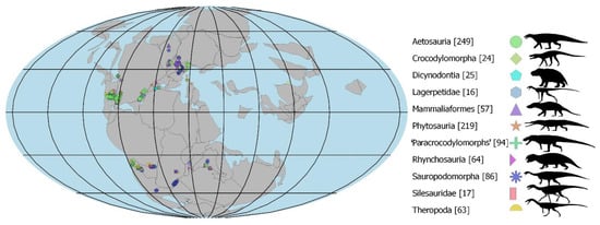 - Butler, R.J.; Brusatte, S.L.; Reich, M.; Nesbitt, S.J.; Schoch, R.R.; Hornung, J.J. The Sail-Backed Reptile Ctenosauriscus from the Latest Early Triassic of Germany and the Timing and Biogeography of the Early Archosaur Radiation. PLoS ONE 2011, 6, e25693. [Google Scholar] [CrossRef]
