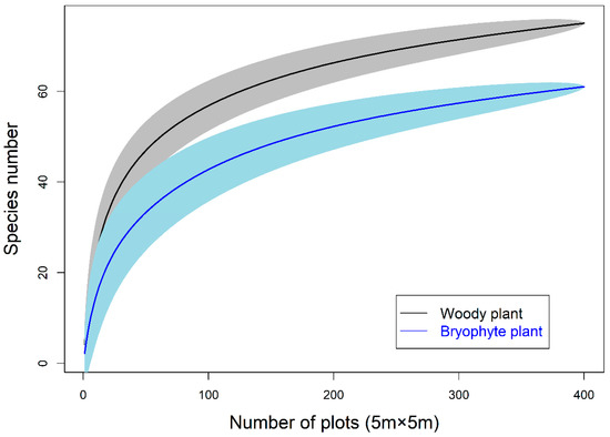 A total of 3318 woody plants belonging to 75 species were identified in the plot (Table S4). We recorded 988 epiphytic bryophyte specimens belonging to 61 species in 254 woody plants (Table S5). Two hundred and fifty-four woody plants belong to 15 families, 21 genera, and 28 species. The results of the species accumulation curve showed that the sampling area of the plants and bryophytes is sufficient in this study (Figure 2).