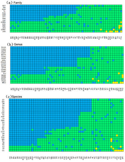 Associations between bryophyte species and woody plants (α = 0.05 level of significance for torus-translation test). Blue squares denote significant positive associations, yellow squares denote significant negative associations, and green squares denote neutral associations. The abbreviations of woody plant and bryophyte species are shown in Tables S4 and S5. (a) is at family level, (b) is at genus level and (c) is at species level.