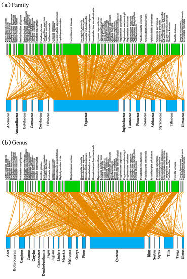All the families (15), genera (20), and species (28) of woody plants were positively associated with two or more of the bryophyte species. Fewer bryophyte species were positively associated with Ostrya japonica Sarg. (5), Tilia paucicostata Maxim. (4), Carpinus cordata Bl. (6), Dendrobenthamia Hutch (7), Sorbus L. (6), Maackia Rupr. (4), Tsuga Carr. (3), Meliosma Bl. (5), Cornaceae Bercht. and J. Presl (7), Aceraceae Juss. (5), Anacardiaceae R. Br. (6), Leguminosae sp. (4), Corylaceae Mirbel (3), and Juglandaceae DC. ex Perleb (4). The negative associations are also concentrated in these families, genera, or species of woody plants (Figure 4).
