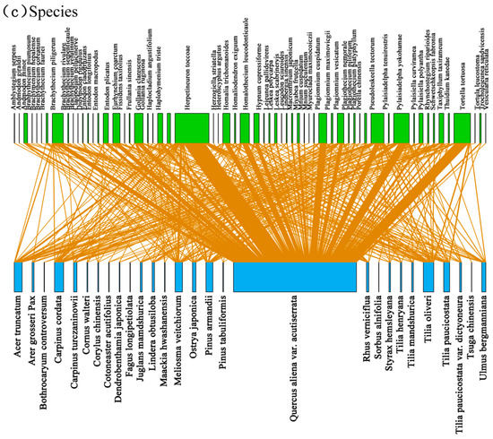 Bipartite display of the plant and bryophytes network. The entire network includes all the 28 woody plant species in 21 genera and 15 families (top) and the 61 bryophyte species (bottom). The thickness of lines and the size of rectangles represent the number of observed associations. (a) is at family level, (b) is at genus level and (c) is at species level.