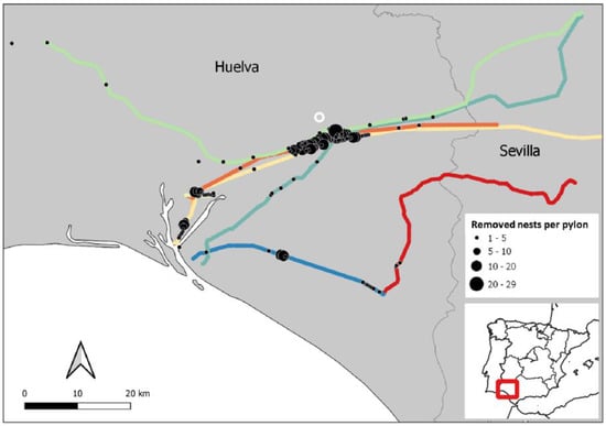 - Moreira, F.; Martins, R.C.; Catry, I.; D’Amico, M. Drivers of power line use by white storks: A case study of birds nesting on anthropogenic structures. J. Appl. Ecol. 2018, 55, 2263–2273. [Google Scholar] [CrossRef]