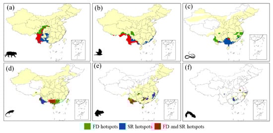 Geographic distributions of functional diversity (FD) hotspots and species richness (SR) hotspots. The green indicates FD hotspots, dark blue indicates SR hotspots and red indicates FD and SR hotspots. (a): Mammals; (b): Birds; (c): Snakes; (d): Lizards; (e): Anura; (f): Caudata. Silhouettes were downloaded from PhyloPic (www.phylopic.org, accessed on 14 December 2020). The map content approval number is GS(2019)1822.