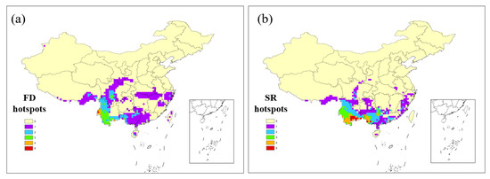 Overlapping of diversity hotspots among taxa. (a): Functional diversity hotspots; (b): Species richness hotspots. The map content approval number is GS(2019)1822.