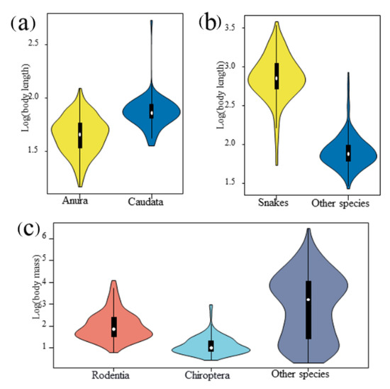 Differences of functional traits among taxa. (a): Body length of Anura and Caudata; (b): Body length of snakes and lizards. (c): Body mass of different groups of mammals.