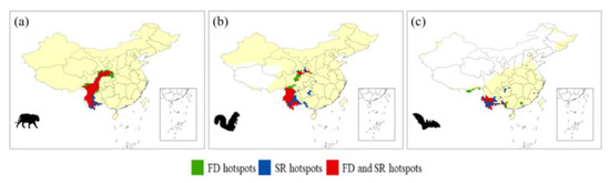 Geographic distributions of functional diversity (FD) hotspots and species richness (SR) hotspots of different groups of mammals. The green indicates FD hotspots, dark blue indicates SR hotspots and red indicates FD and SR hotspots. (a): Mammalian species besides Rodentia and Chiroptera; (b): Rodentia; (c): Chiroptera. Silhouettes were downloaded from PhyloPic (www.phylopic.org, accessed on 14 December 2020). The map content approval number is GS(2019)1822.