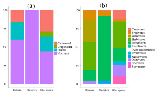 Differences of active time and diets among different groups of mammals. (a): Proportions of active time; (b): Proportions of diets.